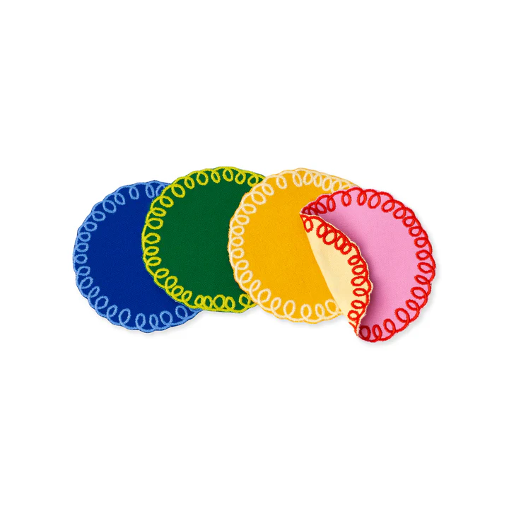 Each piece features stitched curlicue trim in a tonal color. The coasters are double-sided with a reverse contrast color.